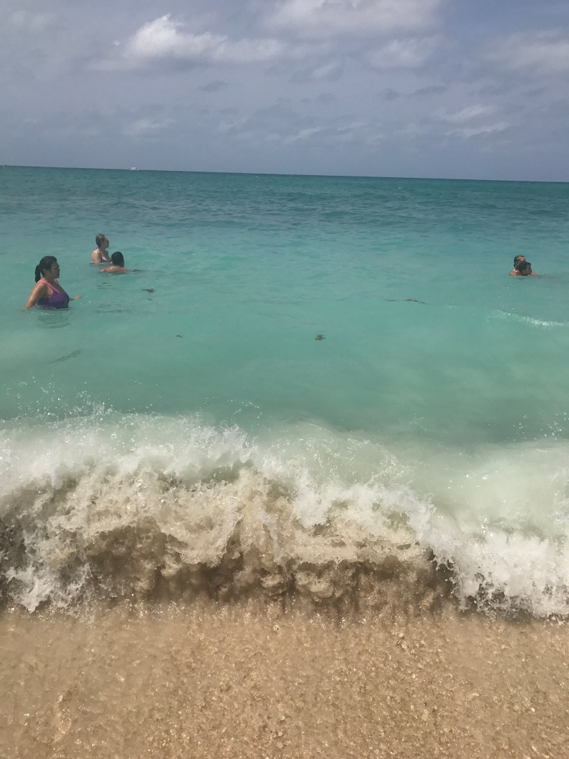 On the Amphibious Tour in the beautiful Grand Cayman Islands, my huz-band, myself, and others on the tour, were taken to their world renown 7 Mile Beach. As the waves crashed against the beach, many times I was almost knocked over. The waves were beautiful and terrible; soft and strong. Several times my phone was almost lost at sea, whilst trying to record myself or take pictures of my beautiful surroundings. After leaving the forceful waters to write me and my husband’s name in the sand, I again gathered my courage to be embraced by the sea. There’s nothing like being in dazzling aquamarine water.